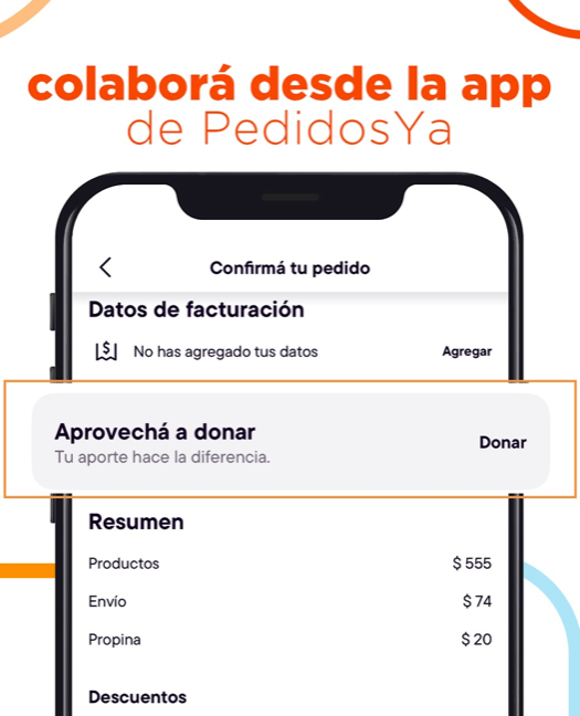 En la App de PedidosYa se puede colaborar con el Banco de Alimentos, clickeando en “aprovechá a donar” al realizar cualquier compra desde la App.
